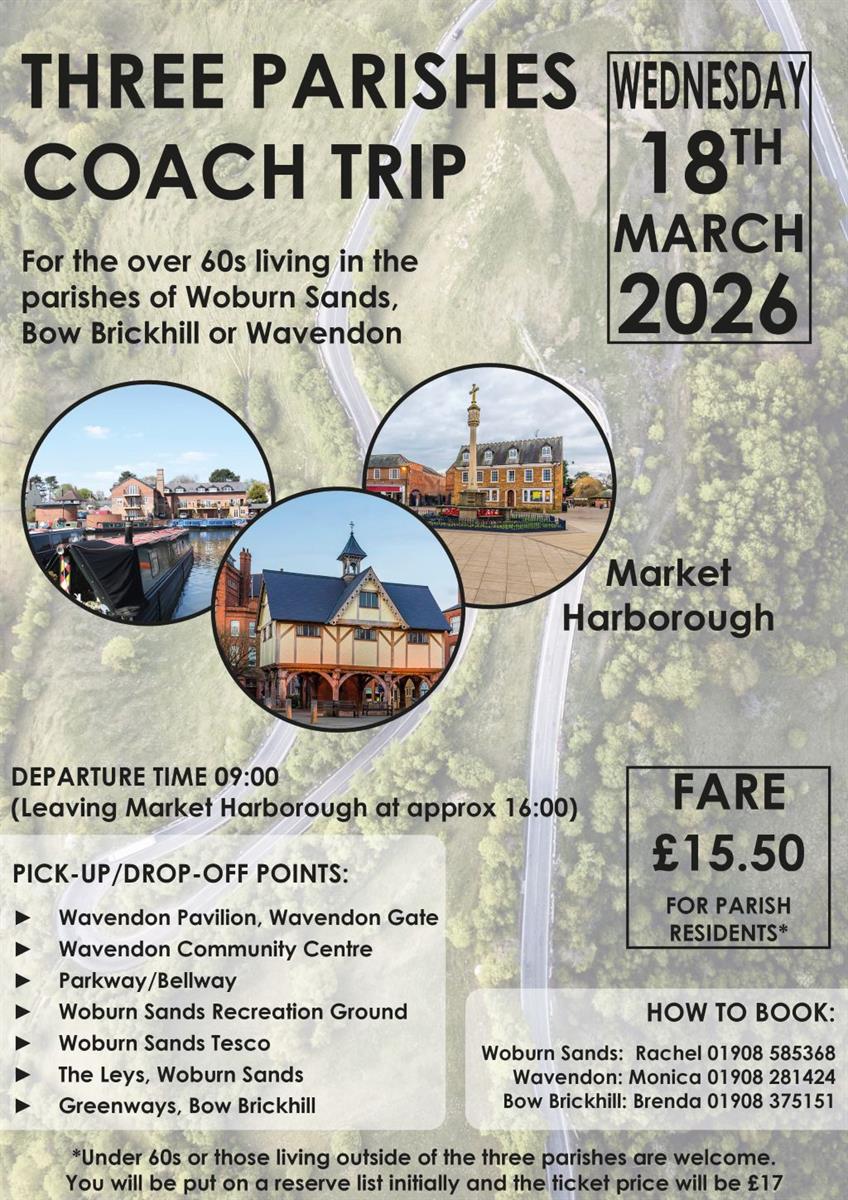 The Three Parishes is a community group supported by the local councils of Woburn Sands, Wavendon and Bow Brickhill. The aim of the Three Parishes is to provide a monthly outing for residents of these parishes who are aged 60 or over. The cost of the trips are subsidised and have been enjoyed by many people over the years. You can find details about the next trip below.